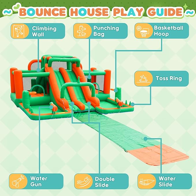 - Slip and Slide: This blow up water slide bouncer has an additional 236.22 inches long waterslide, and to be able to slide the kids down the slip and slide even further, we are giving away two bodyboards.Best of all, slip slide with splash pad