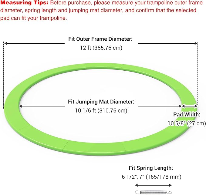 - [How to Choose Trampoline Pad]: Before purchase, please measure your trampoline size (outer frame-to-frame diameter), jumping mat diameter and spring length, and confirm the selected option is correct; It is recommended to change the pad regularly for better performance