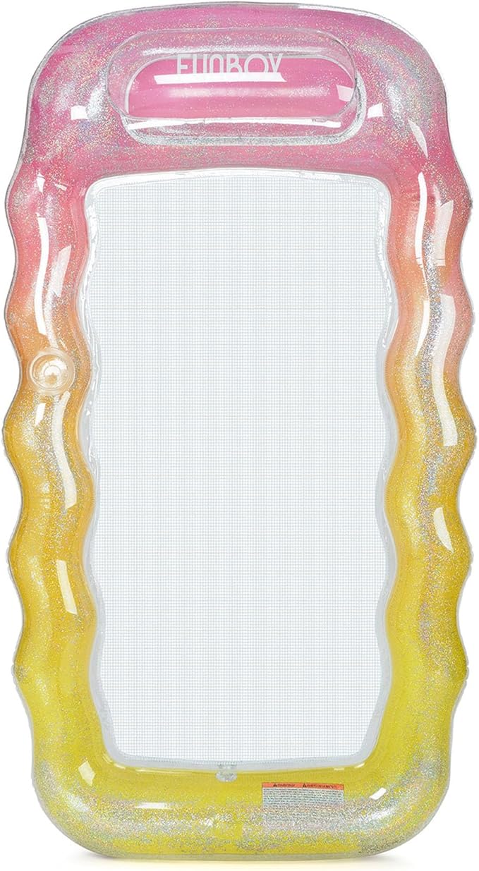 - Limited Edition Ombre Colorway with glitter inside! Inflatable clear top with ombre printing inside and filled with super fun glitter. Outer tube keeps your body floating while the inner mesh allows water to cool your body during the hottest summer days.