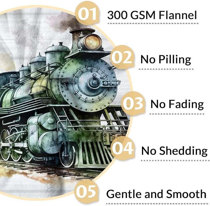 - Cool Train Graphic: Enhance your cozy moments with a charming train graphic printed on the blanket. Whether it's for a child's nursery or a train enthusiast, this design adds a touch of personality to your space