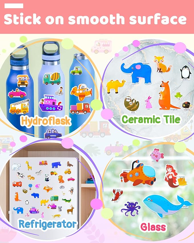 - Reusable Stickers for Kids: Sticker book is made with waterproof, reusable PVC material and contains 101 pieces in 3 themes - Ocean Animals, Animals and Vehicle.