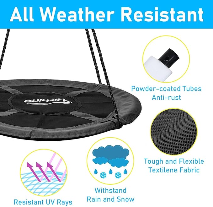 - DURABLE AND ALL WEATHER RESISTANT: Attribute to powder-coated steel frame and textilene fabric,the saucer swing is completely climate compatible.The textilene fabric is tough and flexible,and more resistant to weather,water,abrasion and UV rays,you don’t have to worry about leaving it outside for long time.