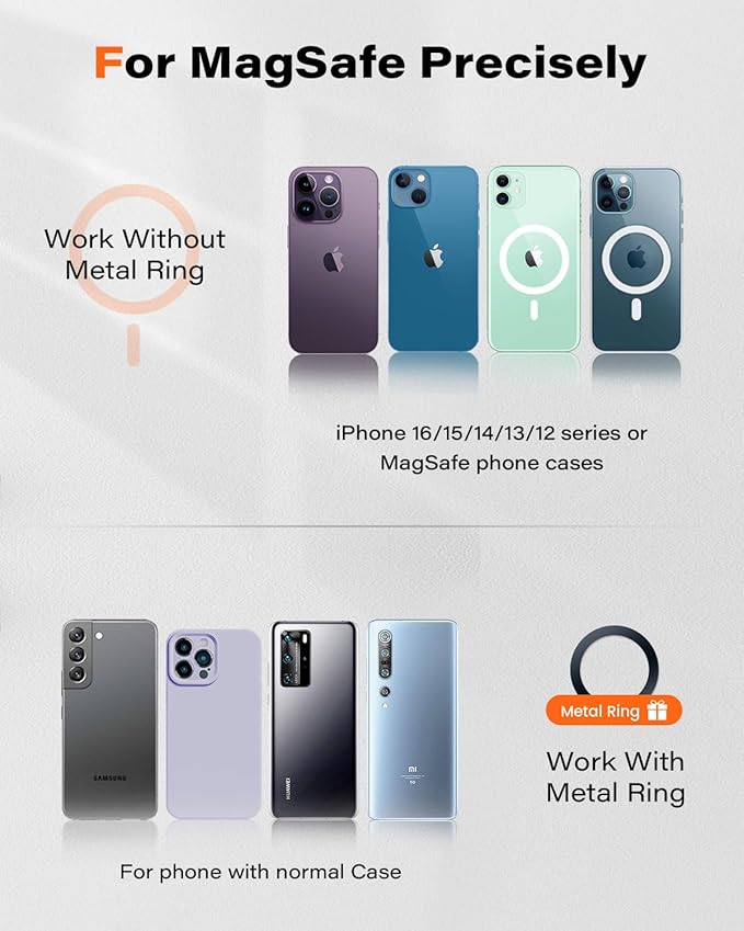 - Wide Device Compatibility: Compatible with iPhone 12-16 series phones and cases featuring Mag Safe functionality. Includes a metal ring for non-Mag Safe phones or cases.