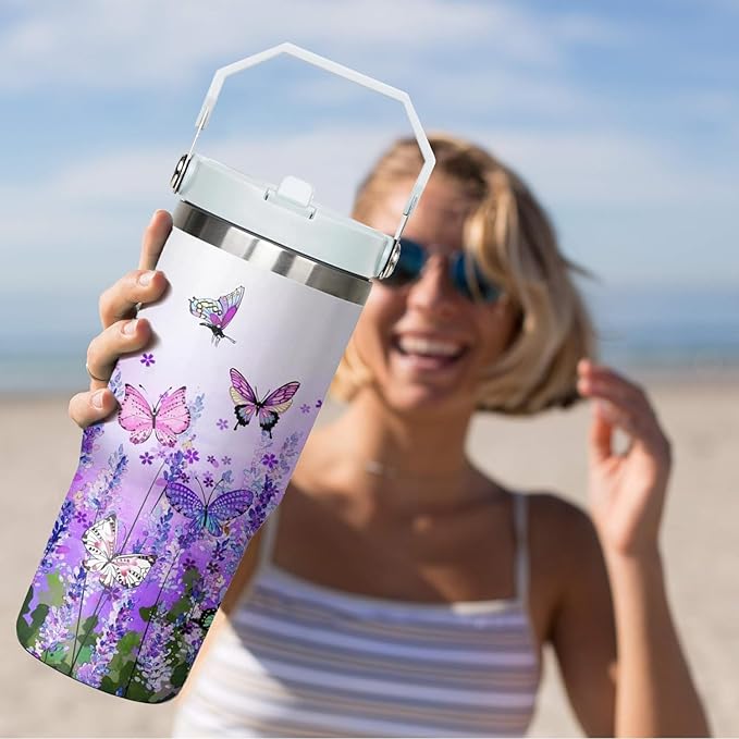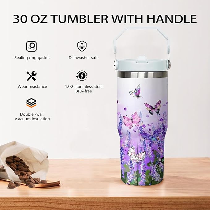 30 Oz Flip Tumbler with Handle Lid and Straw,Purple Butterfly Reusable Tumbler Water Bottle Travel Coffee Cup Mug,Butterfly Gifts for Women Mom Daughter Girlfriend Teenage Girls Bridesmaid