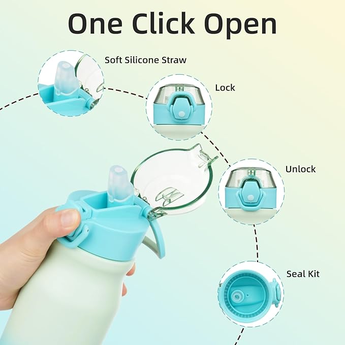 - Leak Proof Locking Lid: Open Your Insulated Water Bottle With The Simple Push Of A Button, Easy For One-Handed Use, The Bottle Has A Protective Cap That Keeps The Drinking Spout Clean, Has A Silicone Locking Latch To Prevent The Lid From Opening