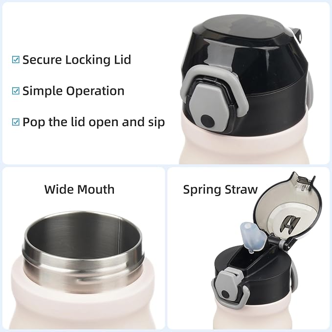 - Equipped with a lockable flip lid and a spring straw, the bottle is leak-proof,left it in your bag without worrying any spills. Simple operation design ensures you Just pop the lid open and sip.Soft silicone spout makes a nice drinking experience.