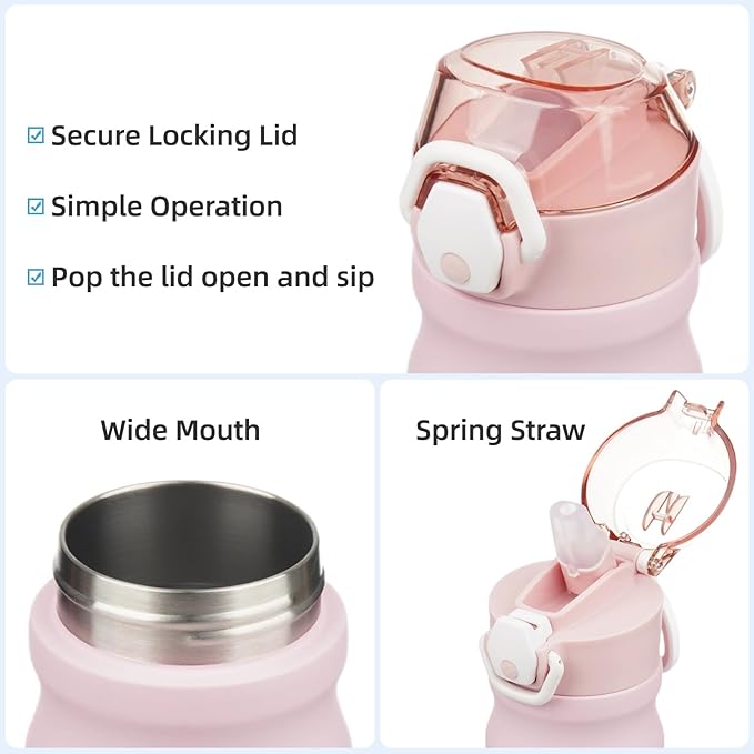 - Equipped with a lockable flip lid and a spring straw, the bottle is leak-proof,left it in your bag without worrying any spills. Simple operation design ensures you Just pop the lid open and sip.Soft silicone spout makes a nice drinking experience.