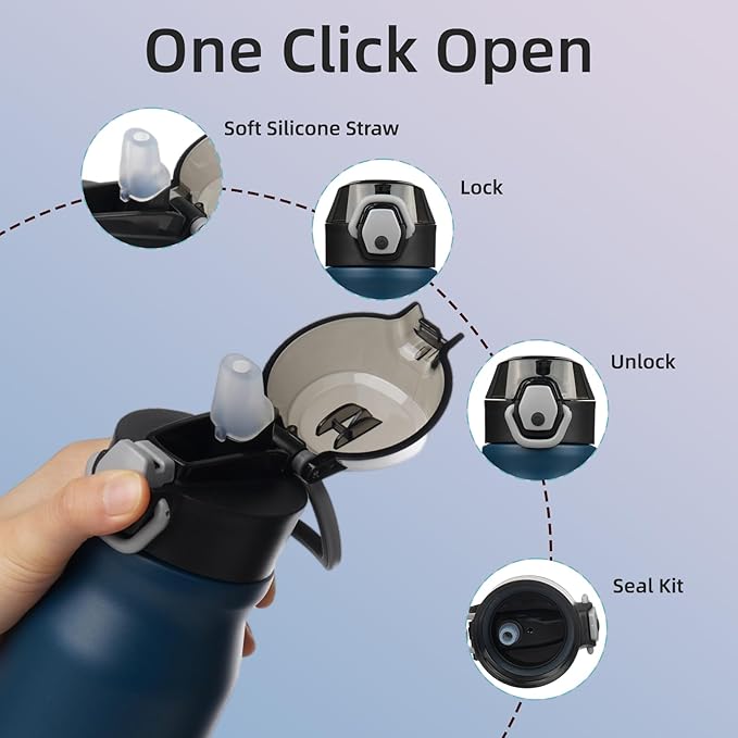 - Leak Proof Locking Lid: Open Your Insulated Water Bottle With The Simple Push Of A Button, Easy For One-Handed Use, The Bottle Has A Protective Cap That Keeps The Drinking Spout Clean, Has A Silicone Locking Latch To Prevent The Lid From Opening
