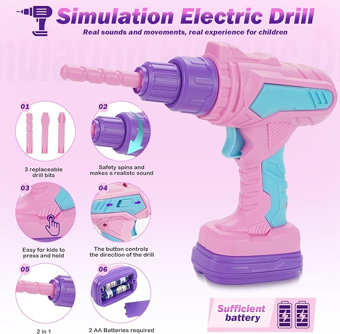 - 【Electric Toy Tool Drill & Realistic Functions】Our toy tool set is fully functional and realistic. Toys Electric drill comes with 3 interchangeable drill bits, which can be automatically rotated by pressing button that simulate sound and movements. Play tools with rich accessories is helps develop kid's fine motor skills and brings more fun, it's an excellent learning tool toy for children.