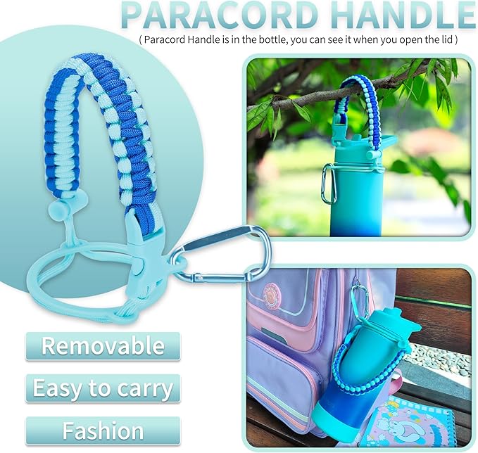 - EASY TO CARRY : Be made with high quality and durable Nylon Paracord. The Detachable Paracord Strap and Carabiner attach to just about anything: backpack,bicycles,stroller,luggage,belt,tree branches. It is easy and convenient to carry the sports water bottle around. Suitable for school, camp, sports, outings, car rides, and so on. (Paracord Handle is in the bottle, you can see it when you open the lid)