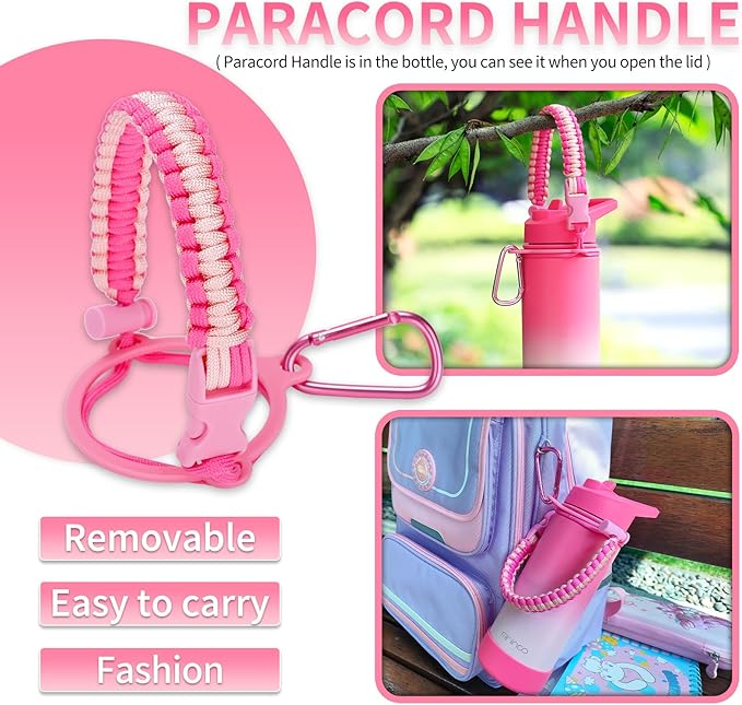 - EASY TO CARRY : Be made with high quality and durable Nylon Paracord. The Detachable Paracord Strap and Carabiner attach to just about anything: backpack,bicycles,stroller,luggage,belt,tree branches. It is easy and convenient to carry the sports water bottle around. Suitable for school, camp, sports, outings, car rides, and so on. (Paracord Handle is in the bottle, you can see it when you open the lid)