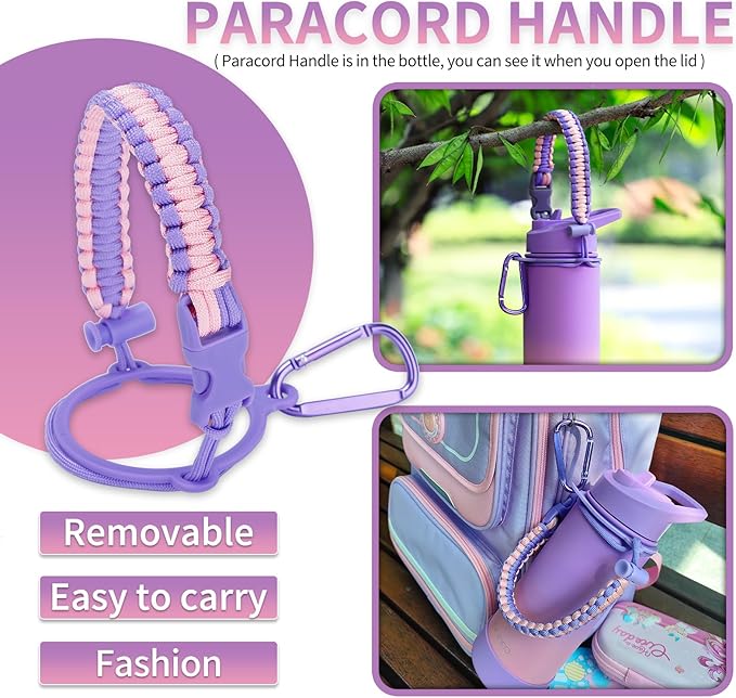 - EASY TO CARRY : Be made with high quality and durable Nylon Paracord. The Detachable Paracord Strap and Carabiner attach to just about anything: backpack,bicycles,stroller,luggage,belt,tree branches. It is easy and convenient to carry the sports water bottle around. Suitable for school, camp, sports, outings, car rides, and so on. (Paracord Handle is in the bottle, you can see it when you open the lid)