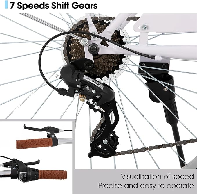- Shifting and Braking: The V-brake system ensures efficient and responsive braking performance, a 7-speed gear system provides sufficient flexibility to handle various riding conditions