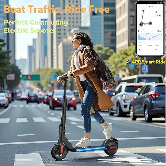 - 【📱Smart Riding Experience】Enhance your ride with the E22 PRO's smart features. Pair the adult electric scooter with the dedicated app on your phone to control cruise control, select speed levels (10MPH / 15.5MPH / 20MPH), manage the light system, and check battery life. This one-stop solution is perfect for your daily commute, offering convenience and advanced functionality.