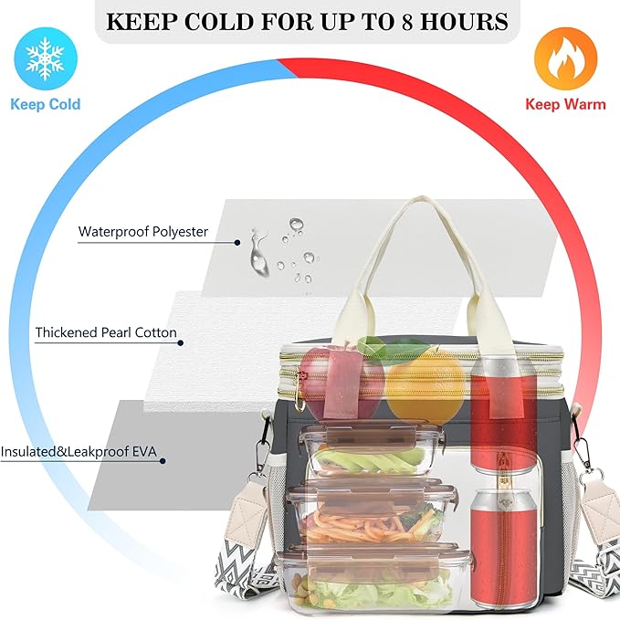 - 【Excellent Insulation & Leak-Proof Interior】The insulated lunch bag is built with a waterproof polyester exterior and 6mm thick insulation, this large lunch box keeps food hot, cold, or fresh for over 8 hours. The seamless heat-pressed aluminum EVA lining is 100% leak-proof and easy to wipe clean—perfect for daily use.