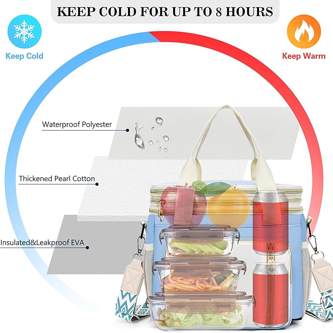 - 【Excellent Insulation & Leak-Proof Interior】The insulated lunch bag is built with a waterproof polyester exterior and 6mm thick insulation, this large lunch box keeps food hot, cold, or fresh for over 8 hours. The seamless heat-pressed aluminum EVA lining is 100% leak-proof and easy to wipe clean—perfect for daily use.