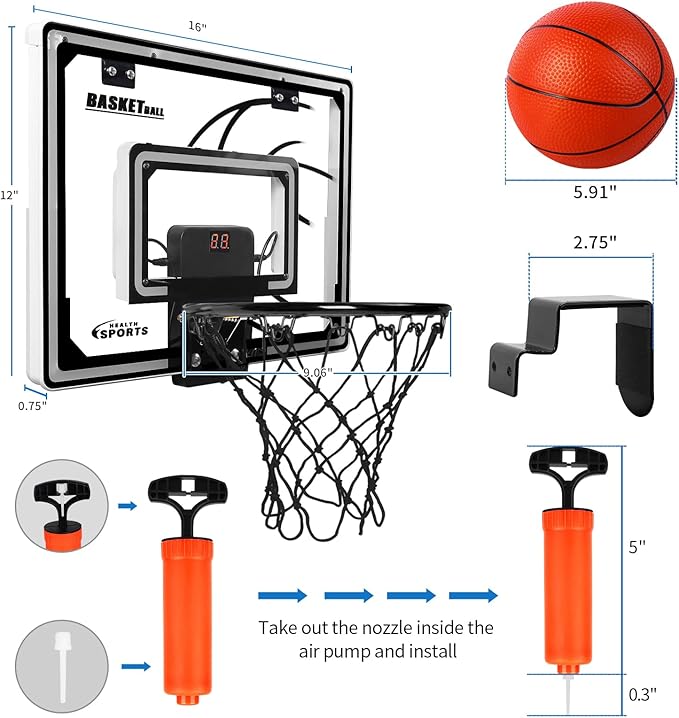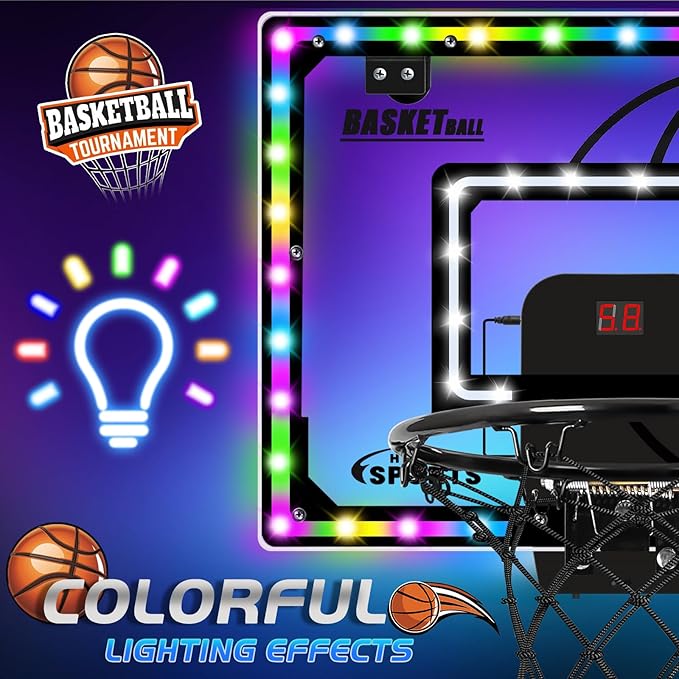 - 【INDOOR BASKETBALL HOOP WITH COLORFUL LED LIGH】Our mini bsketball hoop comes with a audio scorer(3 AAA batteries included), 2 game modes can be choosed, score will be digitally calculated and automatically displayed. Along with the cool and shining colorful lights, the voice system will encourage or cheer for the athletes during the shooting(the sound can be turn off).