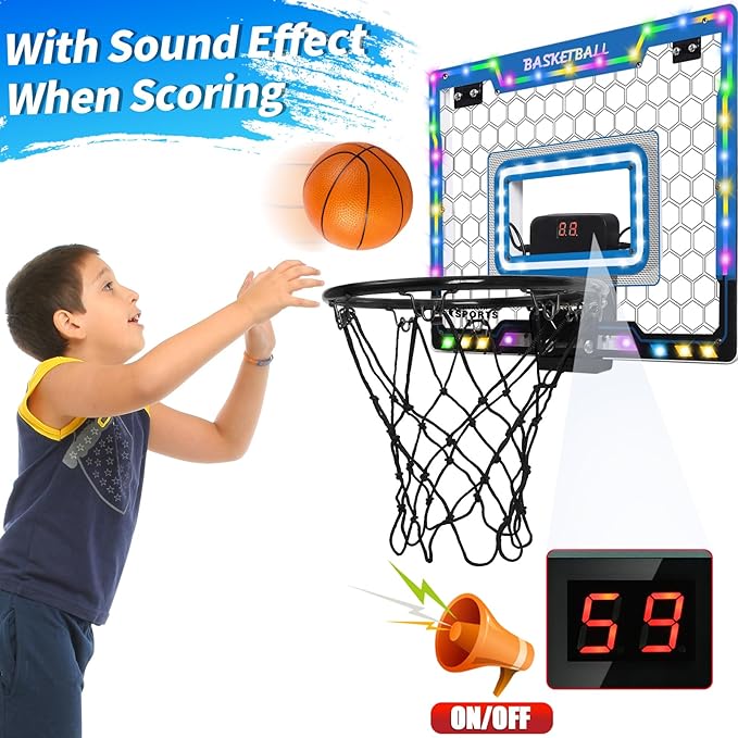 - 【INDOOR BASKETBALL HOOP WITH COLORFUL LED LIGH】Our mini bsketball hoop comes with a audio scorer(3 AAA batteries included), 2 game modes can be choosed, score will be digitally calculated and automatically displayed. Along with the cool and shining colorful lights, the voice system will encourage or cheer for the athletes during the shooting(the sound can be turn off).