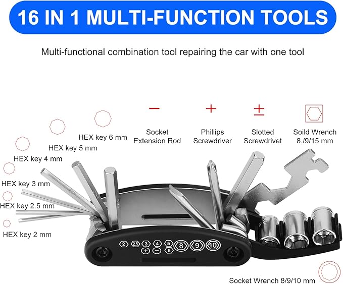 - 16 in 1 Multi-function Repair Tool: Socket Hex Wrench 8/9/10/mm, Solid Wrench 8/10/15/mm, Hex Key Wrench 2/2.5/3/4/5/6mm, Spoke Wrench, Slotted Screwdriver, Phillips Screwdriver, Socket Extension Rod