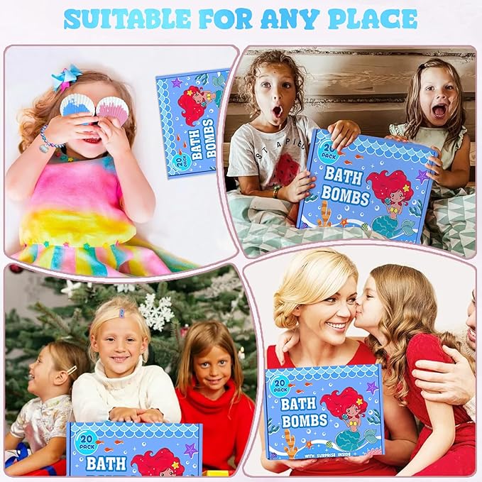 - Fizzy Bath Time:Once dropped in water, these mermaid bath bombs will fizz, giving water a vibrant color. This kids bath bomb set has 20 different scents to make bath time FUN and EXCITING Playing with bubbles makes bath time a splash and relaxing.