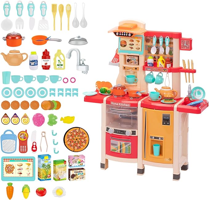 - 🌟【Realistic Interactive Fun for Creative Minds】Immerse your child in the ultimate playtime adventure with our Kids toy kitchen.Featuring a lifelike electronic stove, kids play sink, this set sparks creativity and provides hours of immersive play. Parents, rest assured – our attention to detail ensures a realistic experience that captivates your child's imagination.