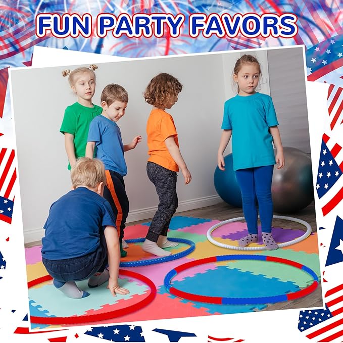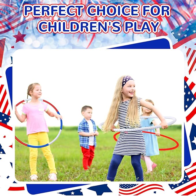 - Colorful and Rich: there are 12 pcs 4th of July themed toy hoops for kids, and each hoop consists of 8 removable plastic blocks for easy storage without taking up much space, and comes in 3 patriotic colors (white, blue, red) that you can combine according to your needs; Plastic clamps feature a light and solid snap design for simple installation