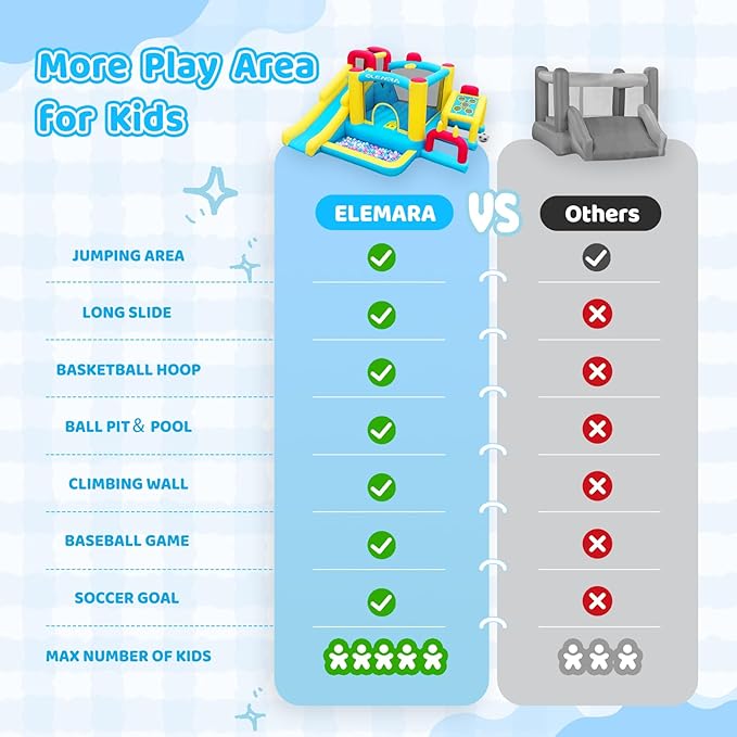 - 7 IN 1 INFLATABLE BOUNCE HOUSE FOR KIDS AND ADULTS: ELEMARA bouncy house is designed with bouncing area; long slide; basketball hoop; baseball area; soccer goal; climbing wall and ball pit. Not only the bouncer, playing baseball and football will also make it novel and fun for your child! Suitable for up to FIVE kids aged three to twelve (with a maximum weight of 99 lb for each kid). Endless fun for your kids.