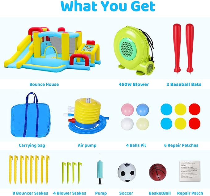 - MEET ALL YOUR NEED: Package including: a Bounce castle; a 450 W blower; a Carrying bag; six repair patches; four blower stakes; eight Bouncer stakes; four balls pit; a football, a basketball, two baseball bats, a pump and an extra repair patch.
