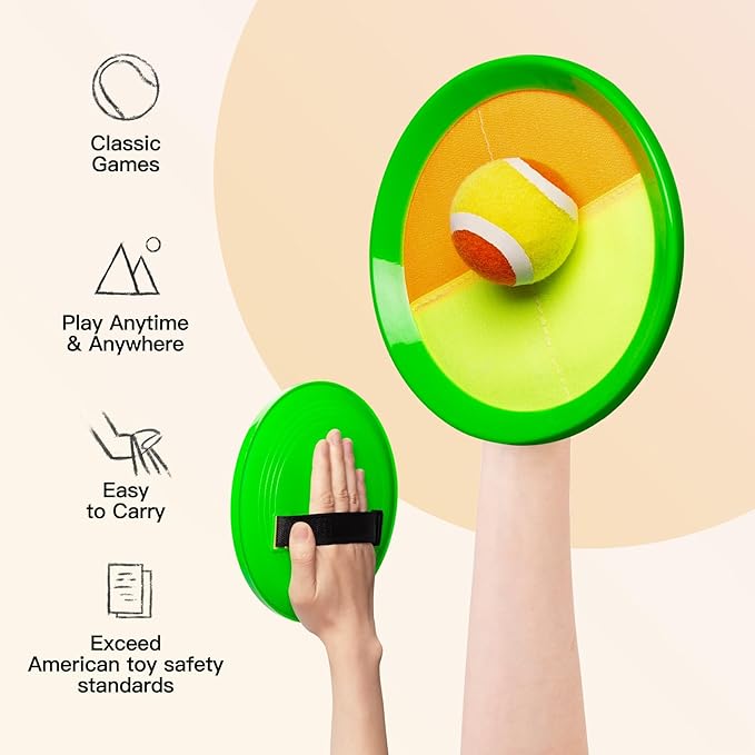- 【Softer and High-quality Ball Set】The old version's tennis balls were very hard and lacked elasticity, making them difficult for kids to catch. Our balls are much stronger and softer, yet still have great stickiness, so kids can easily catch them and enjoy a comfortable feel. Kids won't lose their fun because they can keep catching the ball. This ball game is always lots of fun for little ones, even at family reunions.