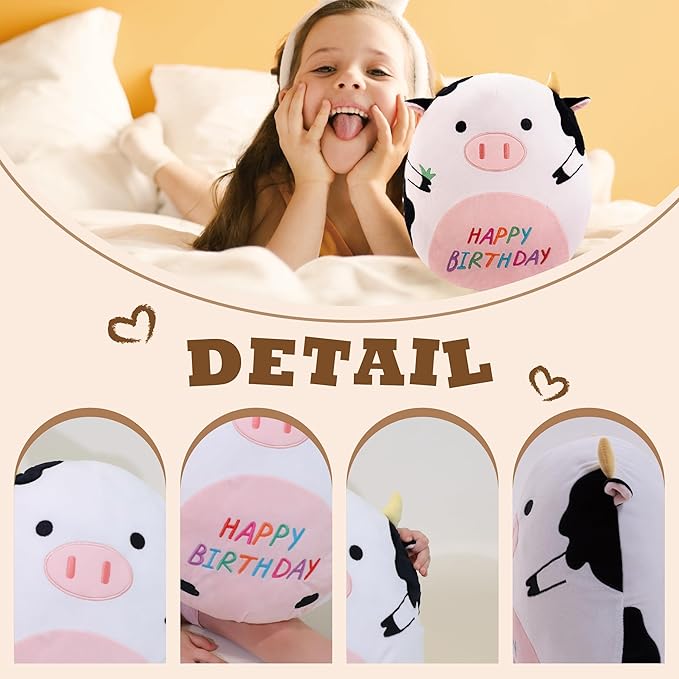 - 【Suitable Scenarios】This birthday cow plush toy isn't just a perfect playmate—it doubles as an incredibly practical plush pillow. Whether you're sleeping, relaxing, or reading, you can snuggle up with it for ultimate comfort. The cow pillow fits anywhere—living rooms, bedrooms, offices, chairs, car seats, and more.