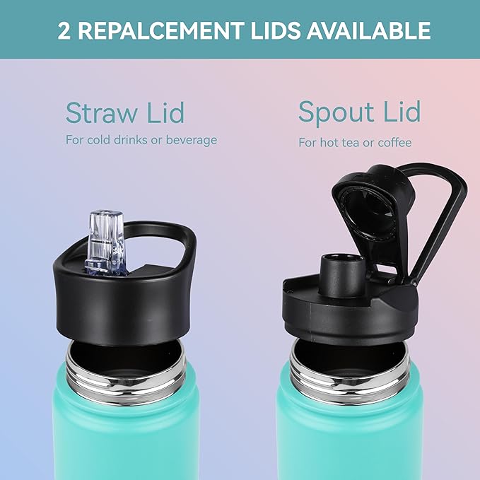 - Spout Lid and Straw Lid: This water bottle comes with 2 lids: an innovative leak-proof spout lid and a newly improved straw lid that has been enhanced for better flow. You can choose suitable lid based on different situations, which increases your options.The wide mouth design makes it very convenient for adding ice or cleaning the inner walls of the bottle