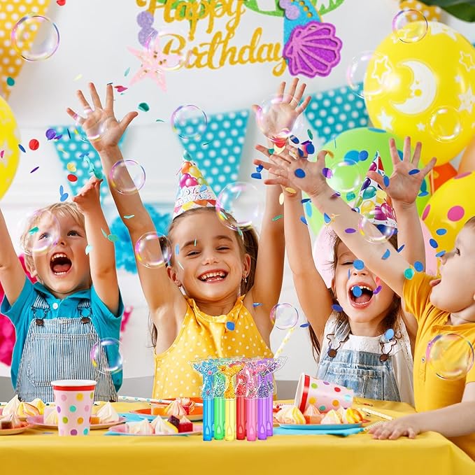 - Glitter Mermaid Bubble Wands: Our Glitter Mermaid Bubble Wands set includes 24 mini bubbles in 6 vibrant colors- Red, Purple, Blue, Pink, Green, to spark joy and wonder at any event, creating magical moments with our Glitter Mermaid Bubble Wands!