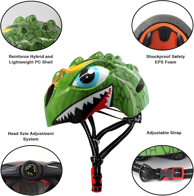 - 【Features】Adjustable Fit - The adjustable dial ensures a snug fit on heads of different sizes. Its side straps provide additional support securing the helmet in place. Cool Comfort - The scooter helmet for kids is breathable and comfortable. Never too hot with air circulation. User comfort - Comfortable removable foam pads prevent pressure points. The lightweight polycarbonate (220g) in-mold shell gives extra comfort and convenience. Super-Cool Design - Cute Vivid Unicorn Dinosaur 3D Design.
