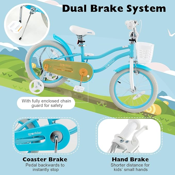 - [ Safe Dual Brake & Sealed Bearing ]: Our children training bicycle is equipped with hand brake (shorter distance design for kids’ small hands) and coaster brake ( pedal backwards to instantly stop). Besides, with fully enclosed chain guard for safety, the toddler bike improves kids’ riding security to a higher level.