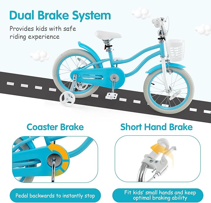 - 【2 Safe Brake System】Equipped with both a hand brake system and a coaster brake system, this girls boys bike offers double the safety. Children can use the hand brake (shorter distance for small hands) or pedal backwards to achieve instant braking. The toddler bike provides additional control and ensures a safe riding experience.