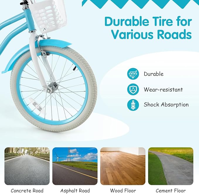 - 【Durable Wheels & Safe Design】With the wear-resistant and shock absorption rubber wheels, this children's training bicycle will let your kids ride with confidence on any surface. The 2 stable and removable training wheels provide balance with ease, while the fully enclosed chain guard protects little fingers from getting pinched.