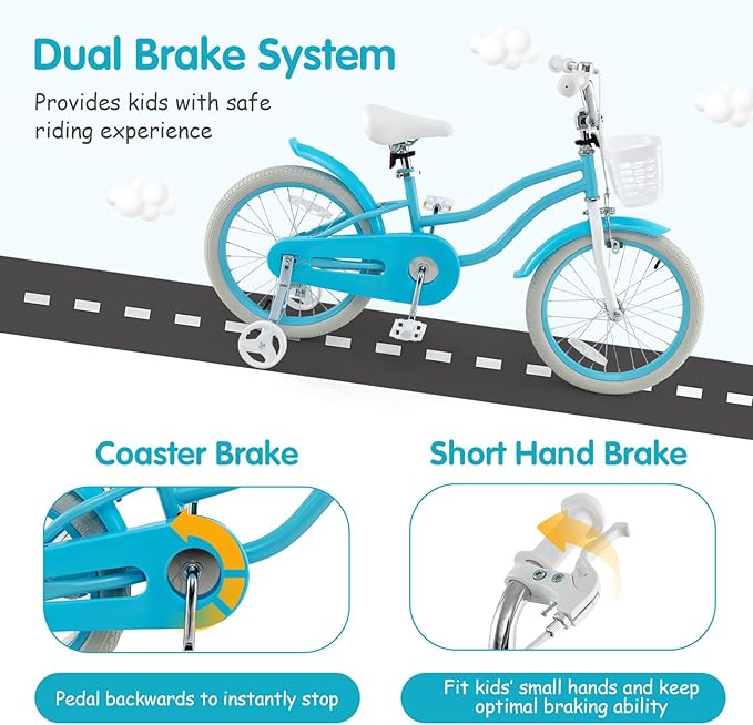- 【2 Safe Brake System】Equipped with both a hand brake system and a coaster brake system, this girls boys bike offers double the safety. Children can use the hand brake (shorter distance for small hands) or pedal backwards to achieve instant braking. The toddler bike provides additional control and ensures a safe riding experience.