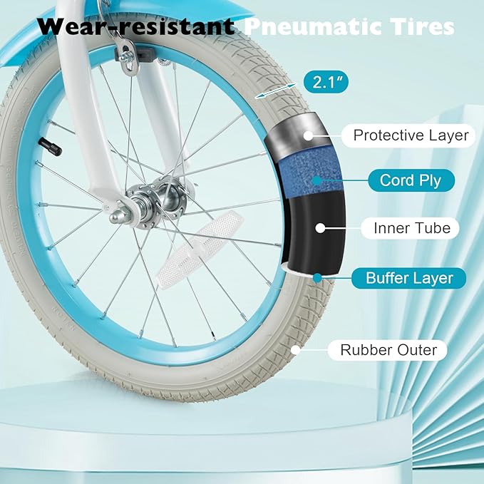 - [ Durable & Comfy Design ]: The wear-resistant pneumatic tires are made of multi-layer materials: rubber outer, buffer layer, cord ply, inner tube and protective layer, offering a safe and steady riding experience. The sturdy carbon steel frame provides long-term use and makes the kids bike easy to ride. What’s more, the PP covered seat improves the overall comfort.
