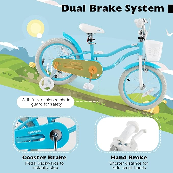 - [ Safe Dual Brake & Sealed Bearing ]: Our children training bicycle is equipped with hand brake (shorter distance design for kids’ small hands) and coaster brake ( pedal backwards to instantly stop). Besides, with fully enclosed chain guard for safety, the toddler bike improves kids’ riding security to a higher level.