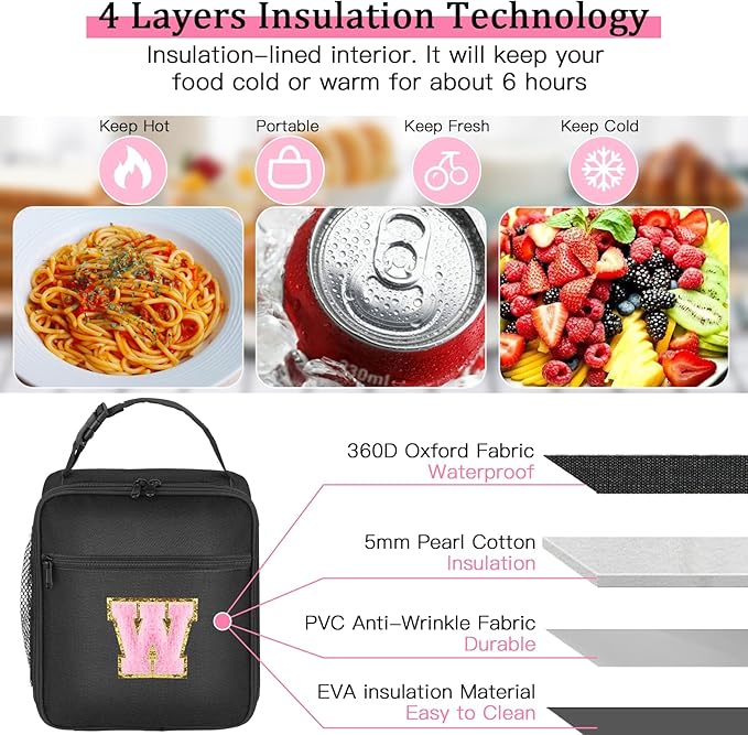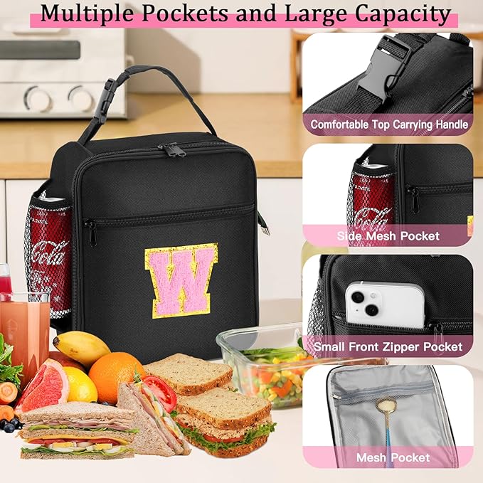 Initial Insulated Lunch Bag, Lunch Box with Initial Letter Patch for Teen Adult, Reusable Lunch Bag for Men Women, Ideal Back to School Gift Birthday Gift, Pink W