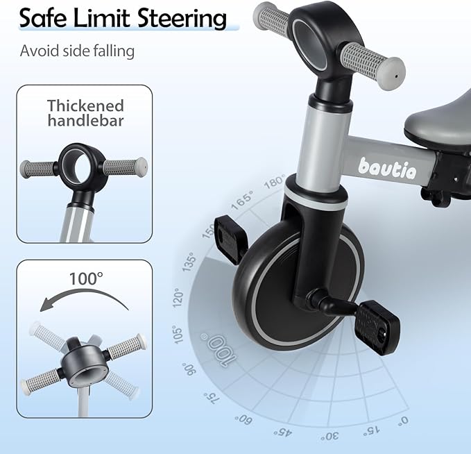 - SAFETY FIRST: The toddler balance bike for 1 2 year old toy is made of high quality materials, BPA Free and stained with bright non-toxic paint. The front wheel has a 100° rotation limit to prevent rollover. Thickened handle cover offers a comfortable grip and non-slip pedals avoid injury during rides