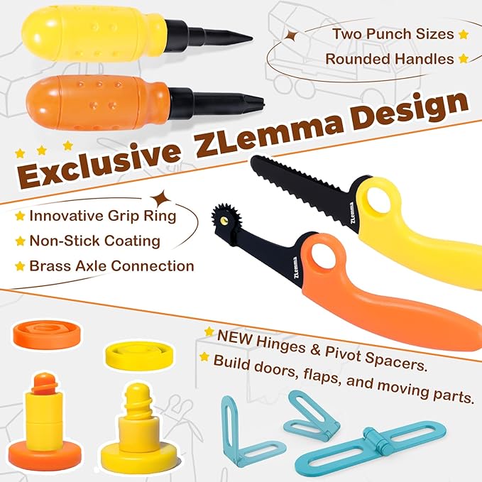 - 🔄 COMPREHENSIVE 401-PIECE TOOL SET – Packed with everything young creators need, including a professional serrated cutter, child-safe cutters, rollers, screwdrivers, bolts, nuts, and connectors. This complete and valuable kit covers all essential steps — cutting, folding, assembling, and decorating — enabling endless cardboard construction ideas