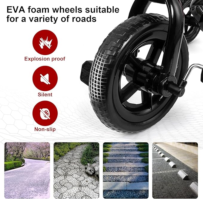 - 🎊Sturdy and Durable: Made of durable carbon steel, this tricycle ensures stability and high quality. The puncture-resistant EVA wheels do not require inflation and won’t scratch or damage floors. The tricycle can handle various outdoor terrains. It also features non-slip rubber handle grips for added comfort.