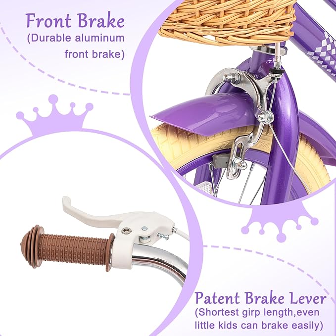 - 【CUTE COMPONENTS】Lovely colors and details, dual brakes (foot and hand), removable height-adjustable wider training wheels for more stable riding, bell and basket for dolls