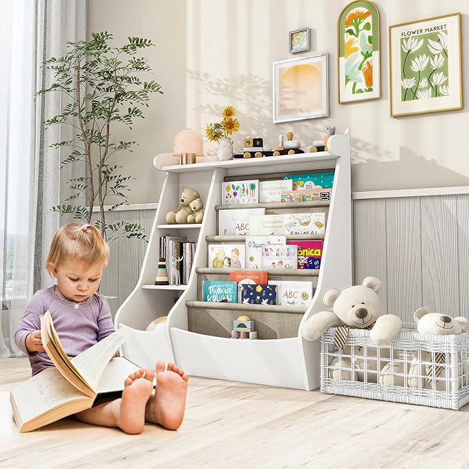 - Deep Storage Sling Pockets:This kids bookshelf with 5 storage slings to hold books with the covers facing forward for easy identification and access. Large space for multiple books. 3 tiers wooden bookshelves can hold children's favorite books, toys, dolls, model cars and building blocks.
