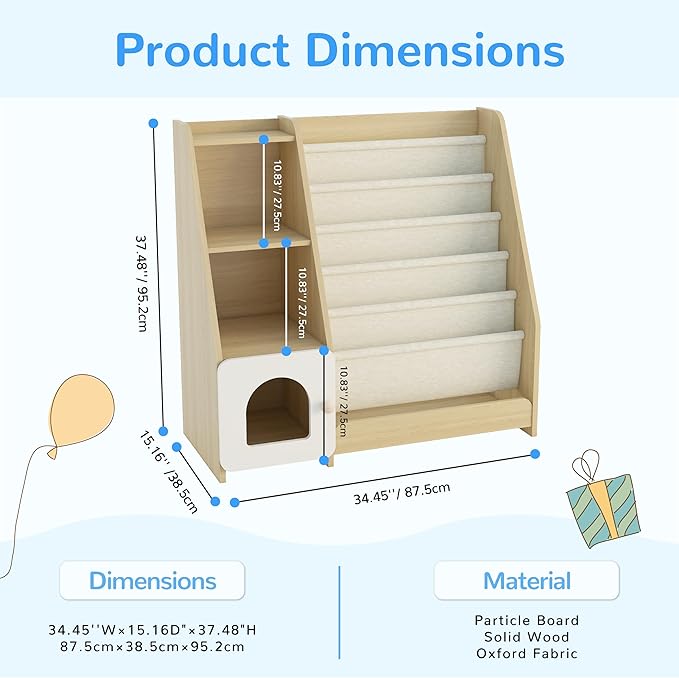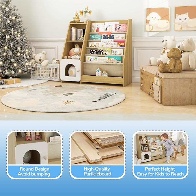 - 【Friendly Material & Rounded Corner Design】:This children's bookshelf is made of high quality particleboard, natural solid wood and oxford fabric. The wood is safe, non-toxic and non-irritating odor. Oxford cloth fabric is strong and sturdy, can hold multiple books without worrying about tearing. The corners of the bookshelf are rounded to protect your child from getting hurt.