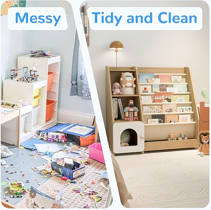- 【Good Habits of Organization and Tidiness】: Kids bookcase helps children organize their rooms neatly and develop good habits of organization and tidiness. There is free space behind the cloth bag, a hidden space where you can put your child's extra toys or balls, so that you don't have to worry about your kis throw away toys all over the room.Get rid of the hassle of messy rooms.