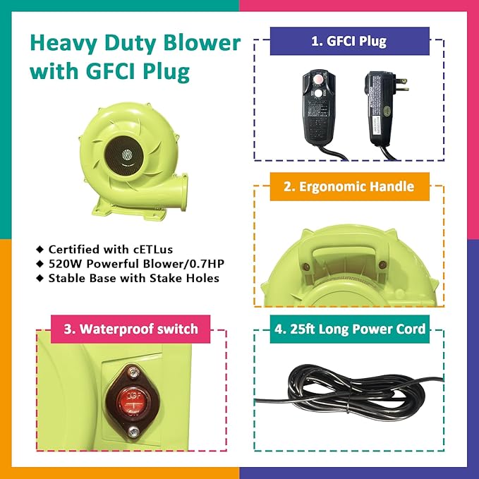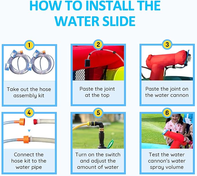 - Easy Mounting and Dismounting - The inflatable water slide castle can be quickly inflated and then used in minutes that perfect for outdoor use in parks, turf, backyards and more. The included carrying bag portability for carrying and storage which allowing your kids play happily anytime and anywhere. The blower's water cap button and GFCI plug keep you and your kids safe while playing!