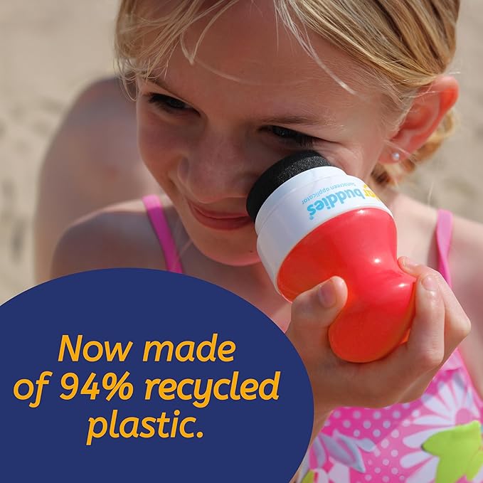 - PERFECT TRAVEL SIZE: Perfectly sized for on-the-go use, it holds 100ml or 3.4fl oz, fitting comfortably in your hand luggage. A clearly marked 100ml indicator under the yellow neck of the bottle helps you stay within liquid carry-on limits. The Solar Buddies refillable sunscreen applicator is a travel essential for kids!