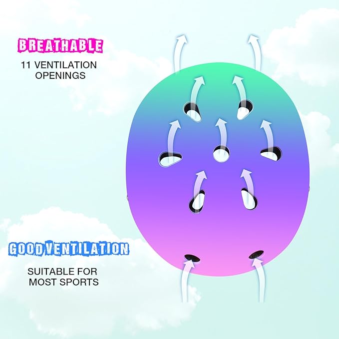 - 🎁Impact Resistance📍: Our sport helmet for kids is made with an impact-resistant ABS shell and high-density EPS foam, providing sturdy, double protection. The internal soft padding absorbs sweat and reduces impact. It is removable for easy cleaning. The toddler bike helmet has 11 vents to keep kids cool and comfortable during various sports. Our goal is to keep kids safe and help them enjoy outdoor activities more.